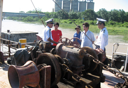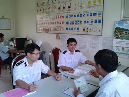 Các cán bộ Cảng vụ ĐTNĐ khu vực I kiểm tra các điều kiện